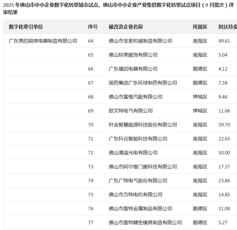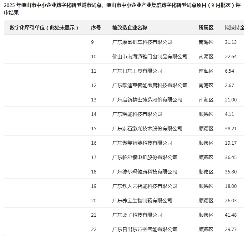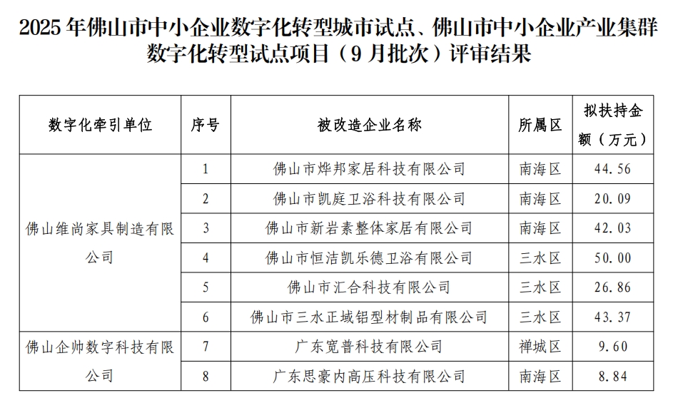 2025年佛山市中小企业数字化转型城市试点、佛山市中小企业产业集群数字化转型试点项目(9月批次)评审结果的公示